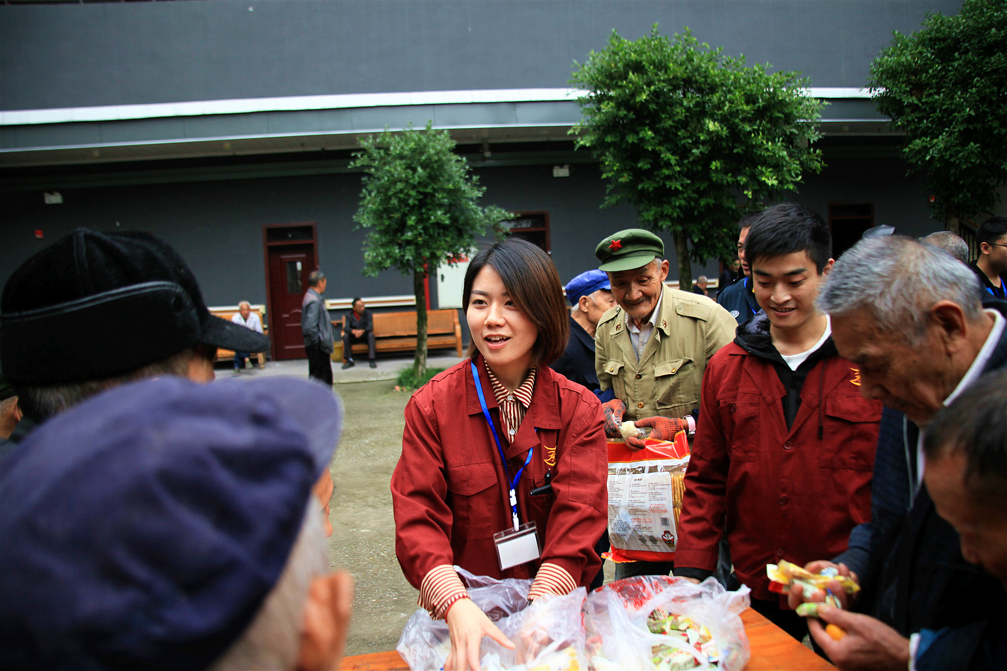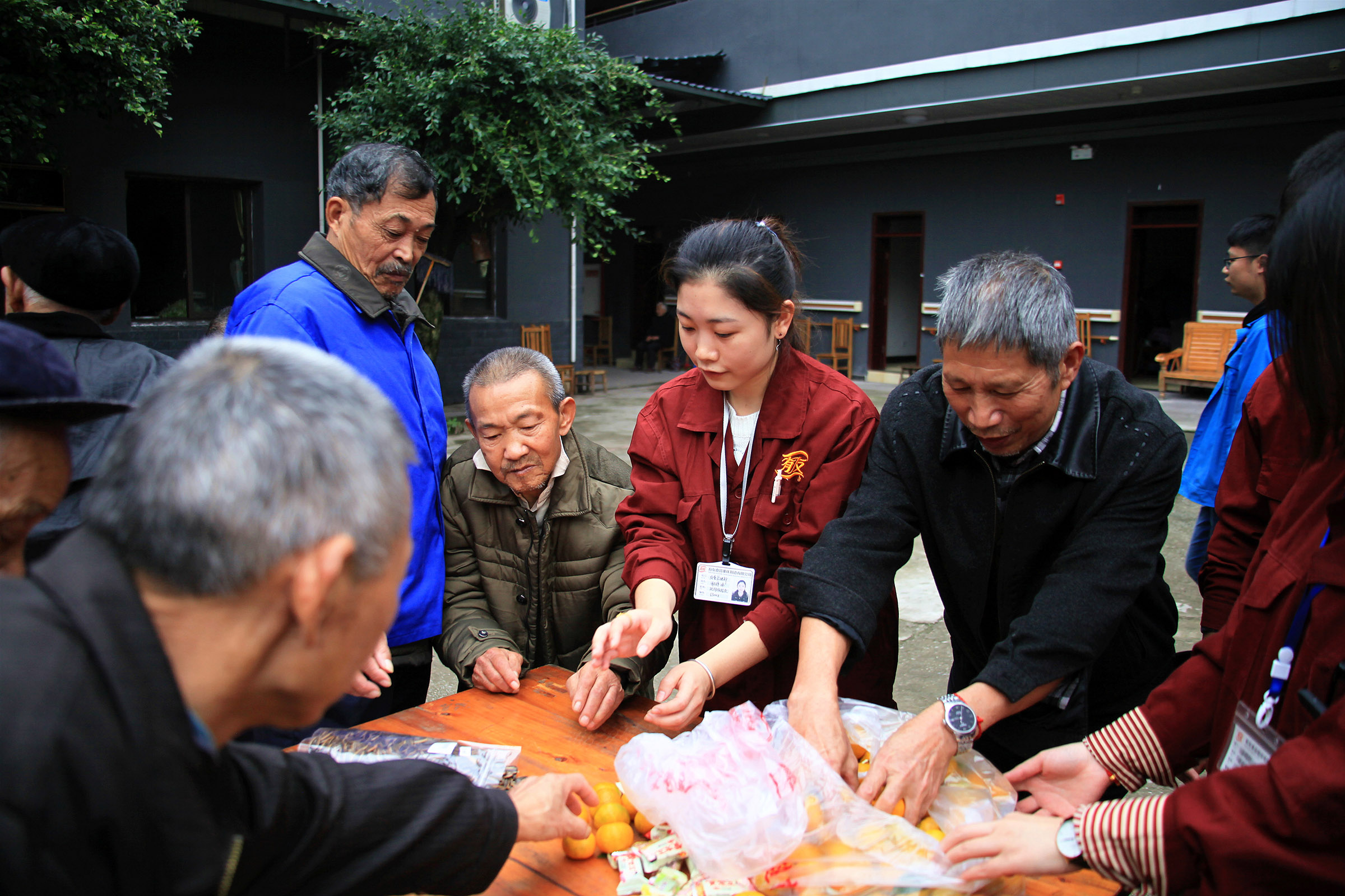活动中,大家边和老人们亲切地拉家常,询问他们身体状况,并边帮助老人们削水果、剥桔子,现场气氛十分温馨融洽。随后大家将毛毯、礼包、水果等慰问品分发至每位老人,同时还向敬老院食堂捐赠了大米和食用油。